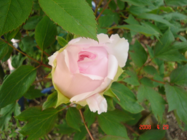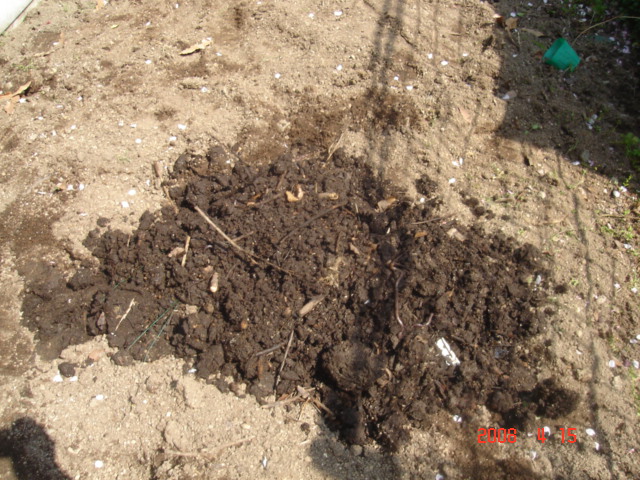 庭の落ち葉をかき集めたものをただ積んでおりました。良い槌にするために油粕と米ぬかをふって、落ち葉を重ねサンドウィッチ状態にしようと思い、掘り返してみると底の方には大きなミミズがたくさん住んでいて、見事な土を作ってくれていました。真っ黒ですよね~。ふむふむ、こうやって良い土は作られるのだと実感。近くの公民館でぼかしを100円で売っていたので購入しました。コンポストのほうも早く良い土にしたいと思います。 今回畑に苦土石灰をはじめてまいてみました。なんか甘くてよい香りがしました。この畑は落花生を植えるつもりです。 こちらの写真は、先日紹介した庭のクライミングローズです。手前のオベリスクにボローニャ、トレリスにピエール・ドウ・ロンサール、バタースコッチ(写ってませんでしたが)。背後に赤いバラ。2階のベランダにからませた部分につぼみを発見。いつもより、早い開花となりそうです。4月4日の写真は今見ると貧弱ですね。今は葉も茂り、もう少し見栄えがよくなってます。ちなみに今年の一番乗りはサマースノーではありませんでした。サマースノー君残念!