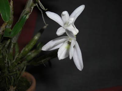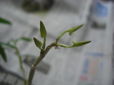 先日のものとは違う石斛(セッコク)の蕾が大きく膨らみました。http://plaza.rakuten.co.jp/ncc74656/diary/200903190000/石斛は毎日水を与えるのではないので今まで気付かなかったの。夏場なら一週間に一度ですが、今の時期なら十日に一度くらいですむのです。ですので十日前には気付かなかった蕾がってわけです。数日で花が咲くとは思いますが・・・・石斛の花はその匂いも楽しめるとか。昨年から育て始めた石斛、昨年は風蘭の花が咲き部屋の中が甘い香りでいっぱいになりましたが、今年は風蘭の花が期待できない様子ですので石斛でね。そして他にも気付いたのが根元に新しい芽が出ていました。このまま大きく育ってくれれば来年も花が楽しめるかな。そして増えて大きな株に育ったら株分けして鉢が増えるね。