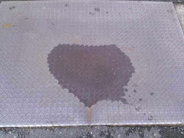 通勤途中で見つけたハート模様。雨が上がった数時間しか見れないハート模様。小さな水路に置かれた鉄板が、車の重みで凹んでしまったのがハートに見えるんだけどね。見つけると嬉しくなるね。
