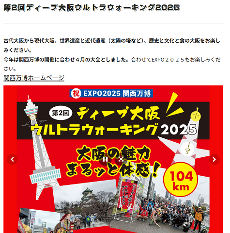 2025年4月19日(土)~20日(日)開催の「第2回ディープ大阪ウルトラウォーキング2025」のサイトを見ていると、「今年は関西万博の開催に合わせ4月の大会としました。合わせてEXPO2025もお楽しみください。」と書いてありました。大阪関西万博を見たいと思っていましたが、きっかけがないと結局見に行かなかったということになりかねないので、この「第2回ディープ大阪ウルトラウォーキング2025」に参加した後、大阪関西万博を見るという事にして、締め切り日に申し込みをしました。小遣いの中から旅費を出すので、ケチケチ旅行にしました。スケジュールは次のようになります。【4月18日(金)】・夜に会社から帰って風呂、食事をする。・東京八重洲で深夜バスに乗る。(東京八重洲→大阪梅田)【4月19日(土)】・8時前に大阪梅田に深夜バスが到着。・ウォーキング会場の八軒家浜に移動。・エントリーして9時から開会式。・10時5分にスタート。大坂城、道頓堀、難波、通天閣、茶臼山、あべのハルカス、ヤンマースタジアム長居、大泉緑地、大仙公園(仁徳天皇陵)、住吉大社、千本松大橋、なみはや大橋、天保山、大阪ドーム、ユニバーサルスタジオジャパン。【4月20日(日)】梅田、淀川、服部緑地、万博記念公園、アサヒビール吹田工場、淀川河川敷、天神橋筋商店街、中之島、八軒家浜。・昼頃ゴール。・夕方に宿泊所にチェックイン。・夜チケットで大阪関西万博を見る。【4月21日(月)】:有給休暇取得・1日チケットで朝から大阪関西万博を見る。・夜に新幹線自由席で東京に戻る。(新大阪駅→東京駅)ーーーーーーーーーーーーーー