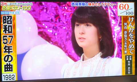 2025年7月21日夜、テレビ東京で「歌謡曲に輝く100曲 3秒聴けば全曲分かる」という番組があり、妻と一緒に見ていると、「けんかをやめて」を歌う河合奈保子さんの映像が紹介されました。新聞のテレビ欄にも、「昭和アイドル大集合」として、河合奈保子さんが印刷されており、ファンとしては感激でした。ーーーーー↓ 河合奈保子さん(17歳)。↓ 「河合奈保子さん」の氏名が2025年7月21日・テレビ東京 テレビ欄に印刷!↓ 2025年7月21日 朝日新聞。