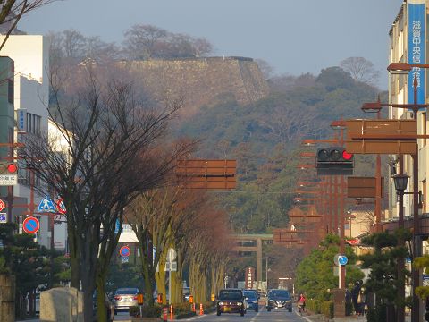 ↑ 駅前通りから彦根城を臨む。