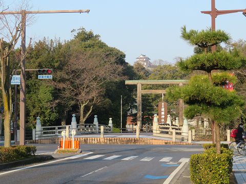 ↑ 護国神社近くから天守閣が見える。