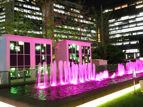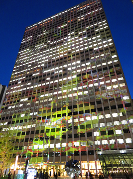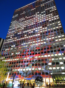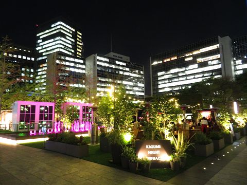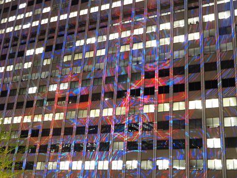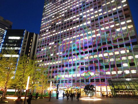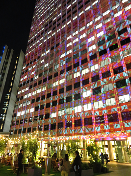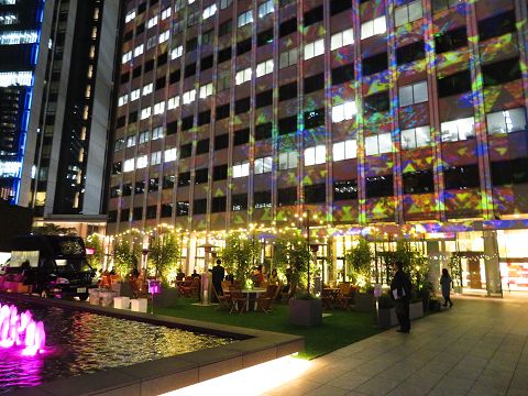デジタル掛け軸としてビルに幾何学模様を投影したり、テラスで飲食ができる場所が用意されたりと、色々なイベントが行われています。