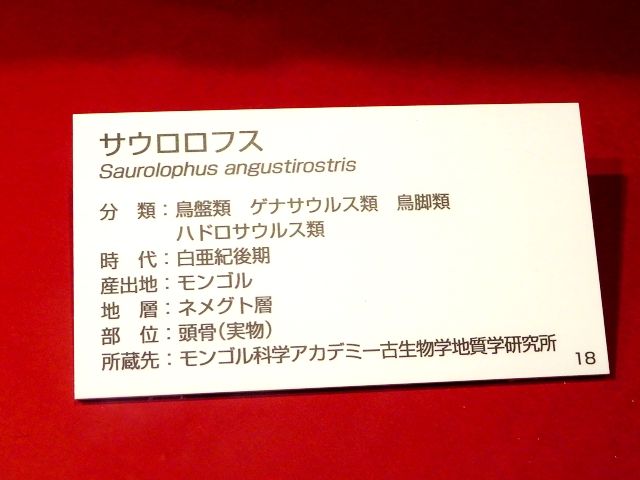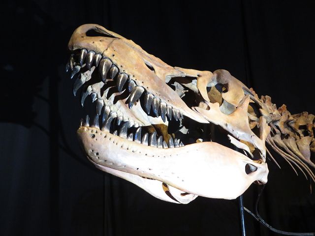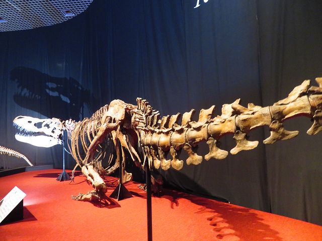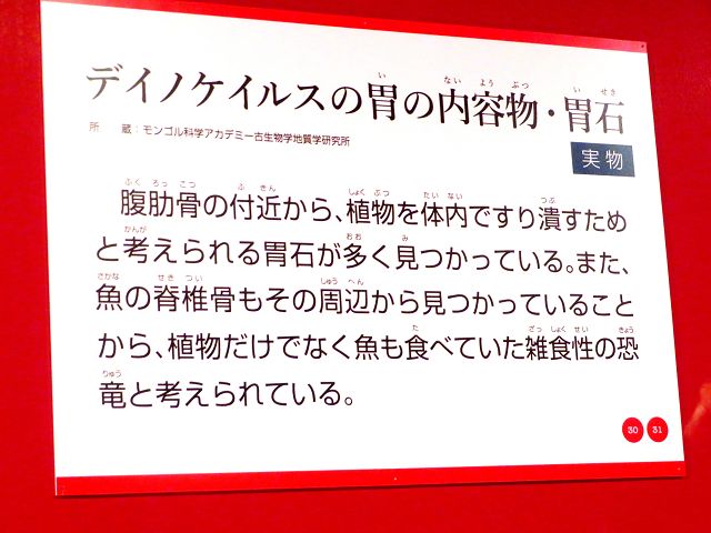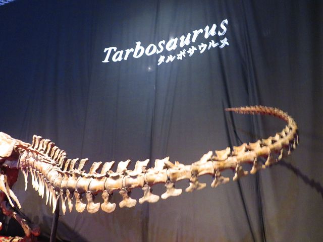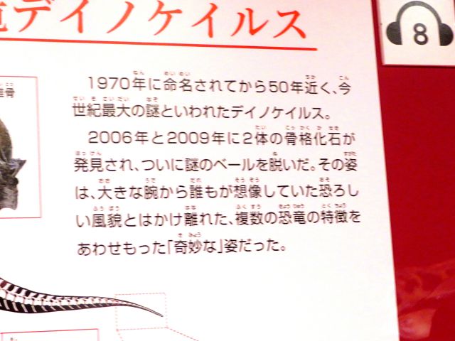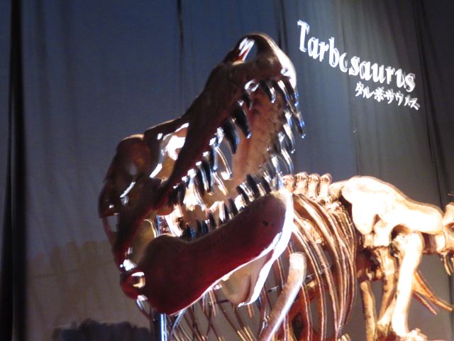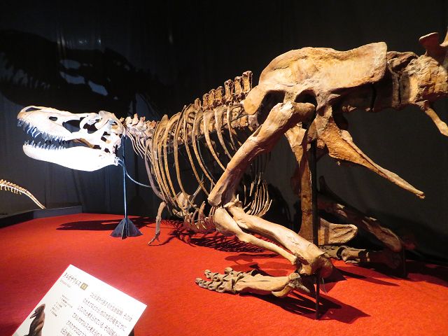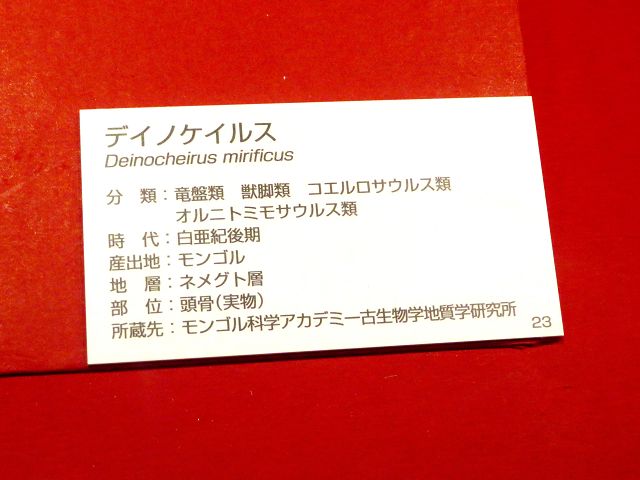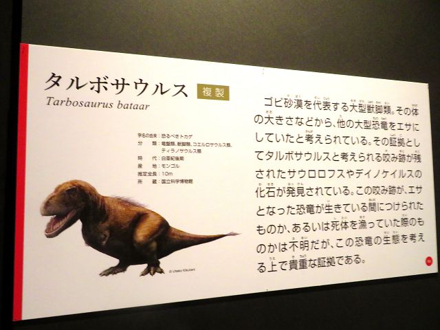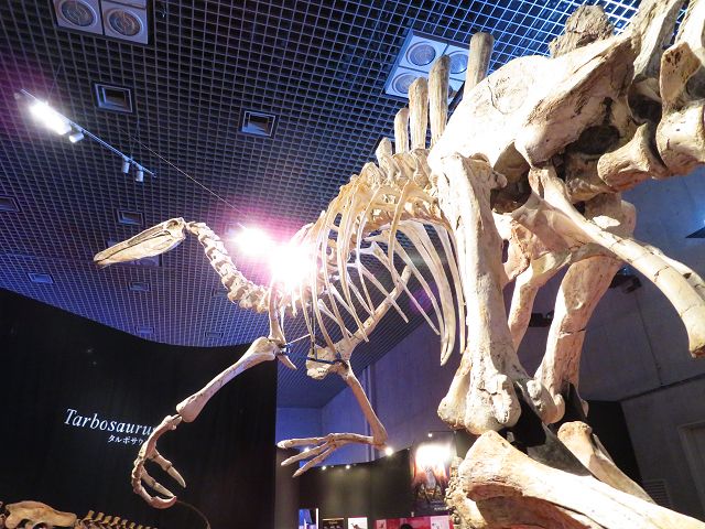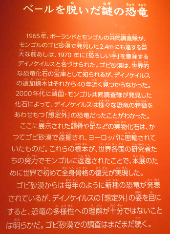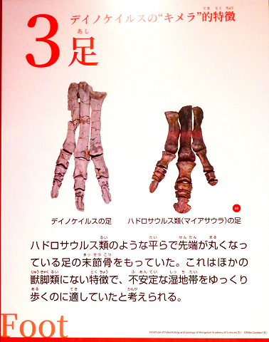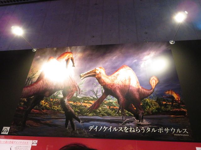 デイノケイルスの骨には傷跡があり、傷の歯型や、同時代にモンゴルで生息していた肉食動物を考えると、デイノケイルスはタルボサウルスに食べられたという事になりました。会場にはデイノケイルスとタルボサウルスの骨格が展示されています。