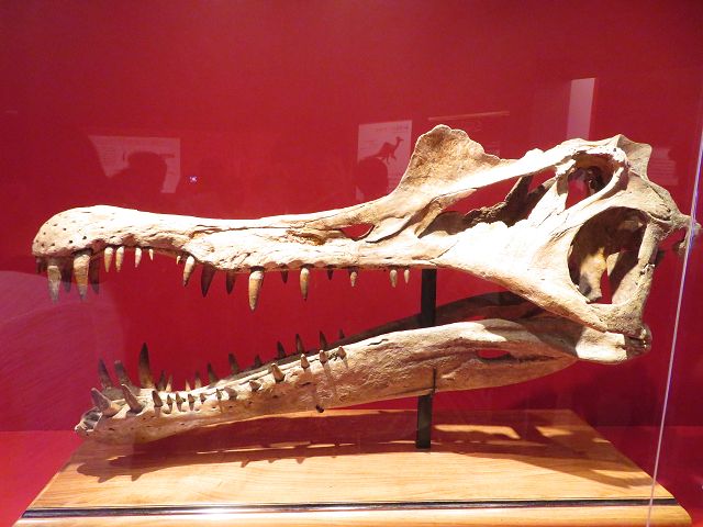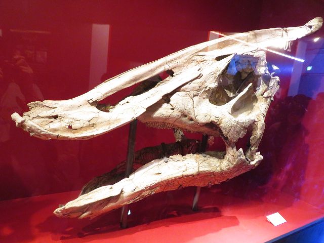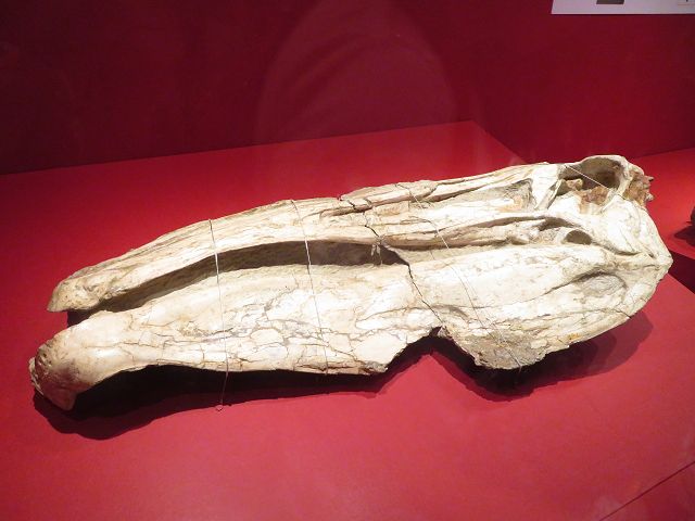 ↑ スピノサウルスの頭骨。前後に長く大きな下あごを持つのが特徴的。