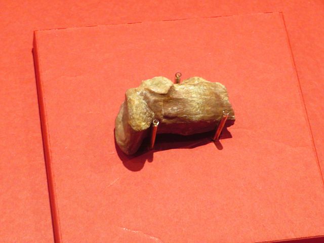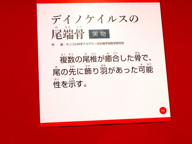 ↑デイノケイルスの尾端骨。複数の尾椎骨が癒合した骨で、尾の先に飾り羽があった可能性を示す。