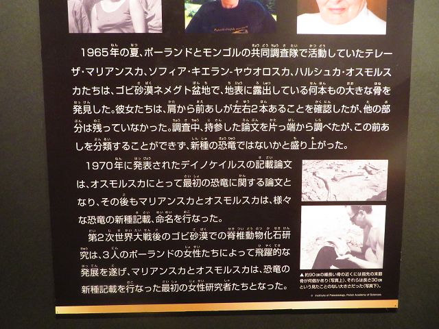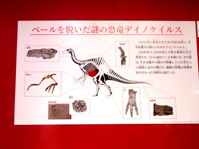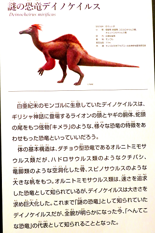 1965年にモンゴル・ゴビ砂漠のメネクト盆地で、ポーランドとモンゴルの共同調査隊で活躍していた女性の研究者達が、地表に露出している腕の部分だけの化石を見つけました。腕は2メートル50センチも長く、ティラノザウルスよりもはるかに大きい生物ではないかということで「恐ろしい手」という意味の「デイノケイルス」という名前が付きました。