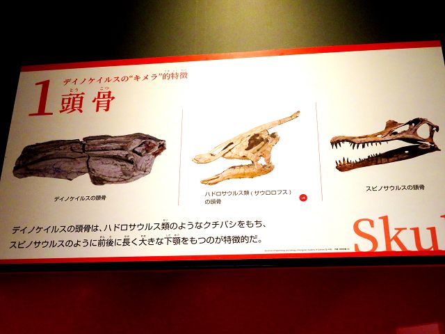 ↑ デイノケイルスの頭骨は、ハドロサウルス類のようなクチバシをもち、スピノサウルスのように前後に長く大きな下あごを持つのが特徴的。