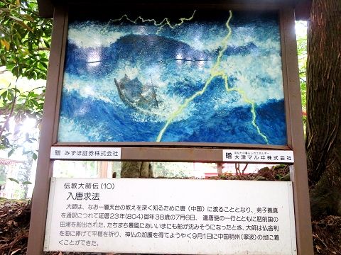 ↑ (10)天台の教えを深く知るため、唐(中国)に渡ることになり、弟子の義真を通訳につれて804年、38歳の7月6日、遣唐使の一行とともに肥前国の田浦を船出した。暴風にあい、船が沈みそうになった時、大使は仏舎利を海に捧げて平穏を祈り、9月1日に中国明州(寧波)の地に着いた。