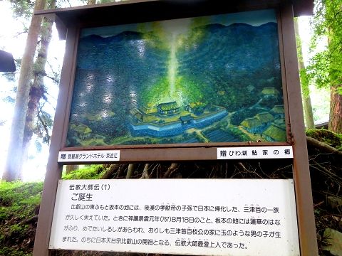 ↑(1) 比叡山の麓の坂本の地には、後漢の孝献帝の子孫で日本に帰化した三津首(みつのおひと)の一族が住んでおり、767年8月18日に三津首・百枝(ももえ)公の家に男の子が生まれた。それが日本天台宗比叡山の開祖となる、伝教大師最澄であった。