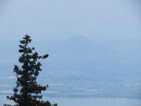 ↑ 延暦寺会館の窓から見た、滋賀県野洲市の三上山。