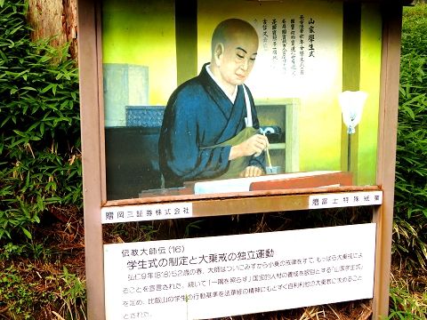 ↑「(16)852年、52歳の時、大師はついに小乗の戒律を捨て、大乗の戒律によることを宣言した。続いて「一隅を照らす」国宝的人材の養成を眼目とする「山家学生式」を定め、比叡山の学生の行動基準を法華経の精神に基づく大乗教に求めた。