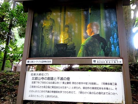 ↑(7)788年には比叡山寺(一乗止観院・現在の根本中堂)を創建し、自作の薬師如来を本尊とし、永代不滅の常燈明を手づから供えた。