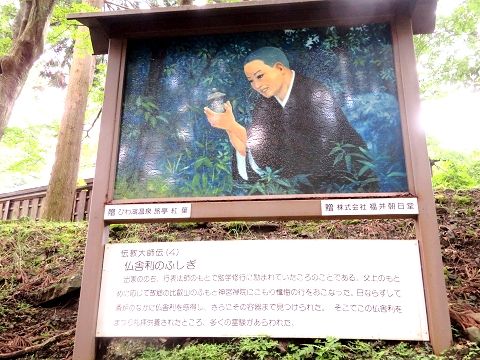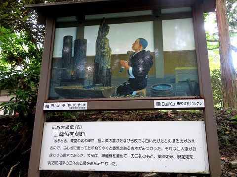 ↑ (6)ある日、香気のある古木が見つかった。それは仙人たちが護っている霊木であった。大師は早速身を清めて、一刀三礼のもと、薬師如来、釈迦如来、阿弥陀如来の三体の仏像を刻んだ。