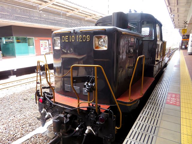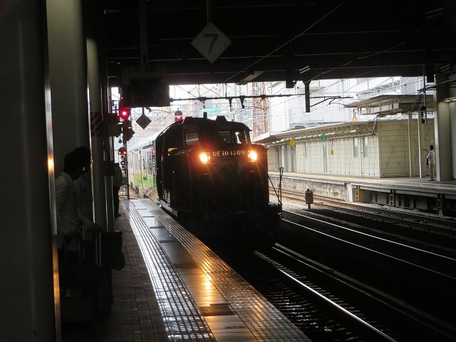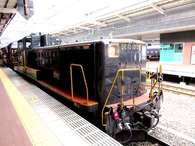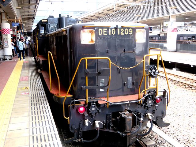 「ななつ星」は、黒い「DE10形ディーゼル機関車DE101209」に牽引されて博多駅に入りました。そして分離されました。