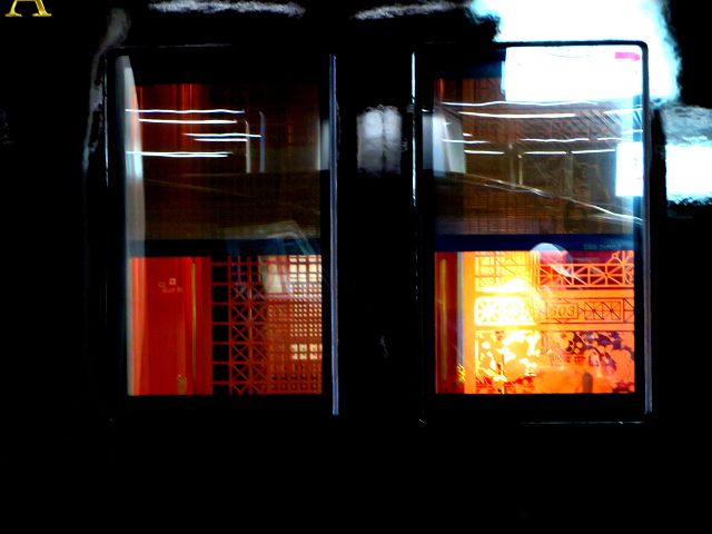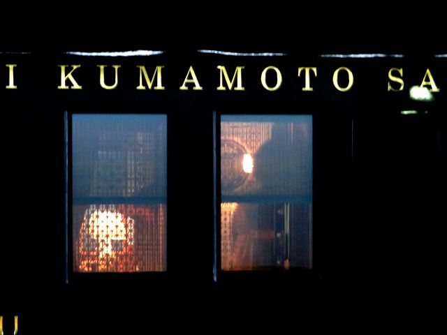 ↑ 「ななつ星」の漆色の車体と、窓から漏れる室内の光。