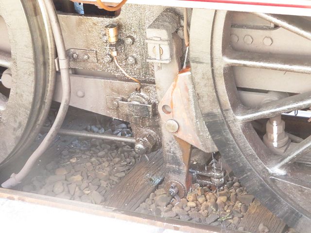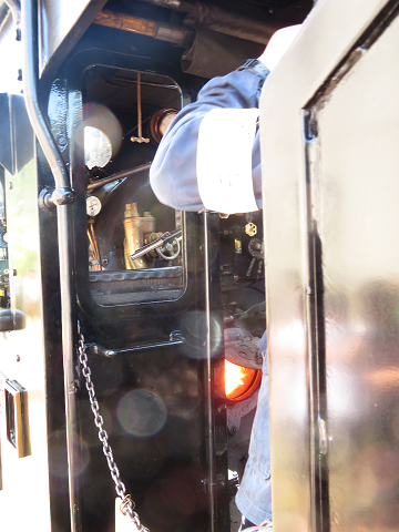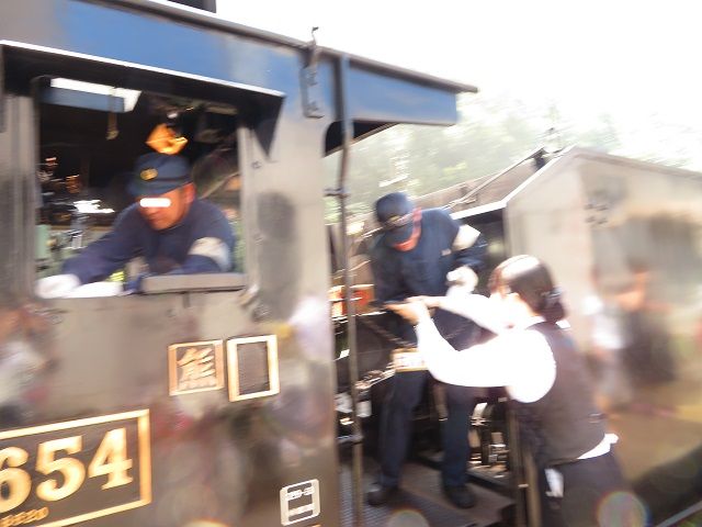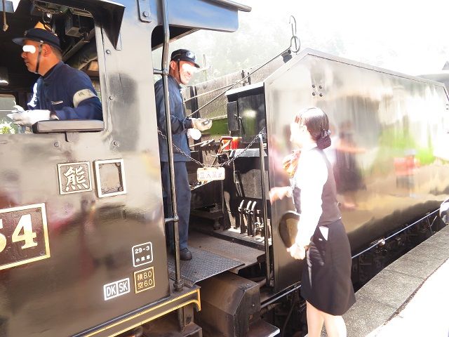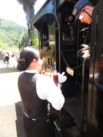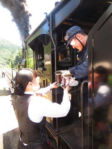 売店の乗務員の方が、SL人吉の運転士、運転助士に冷たい飲み物を渡していました。