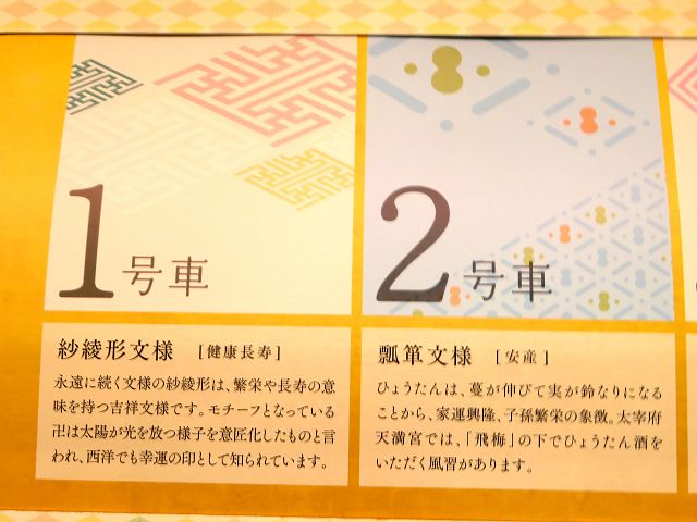 ①【1号車】 「紗綾形文様(さやがたもんよう)」 【健康長寿】。