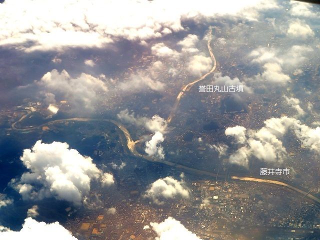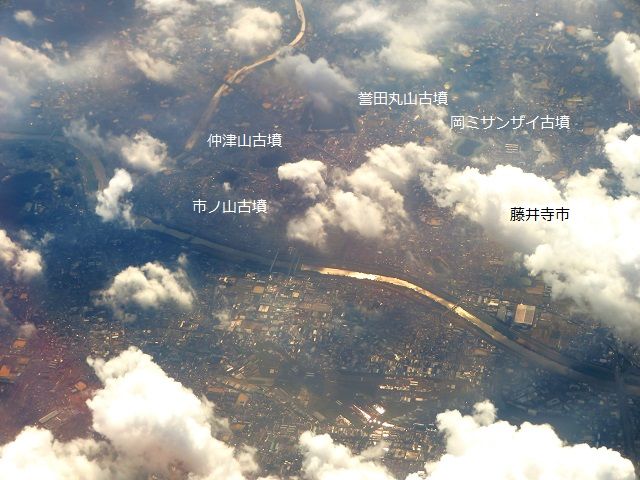 ↑ 藤井寺市付近の古墳群。藤井寺は雲に隠れている。