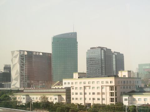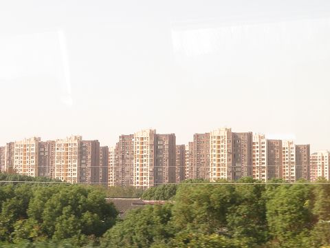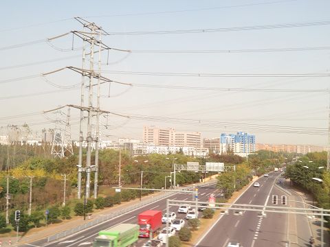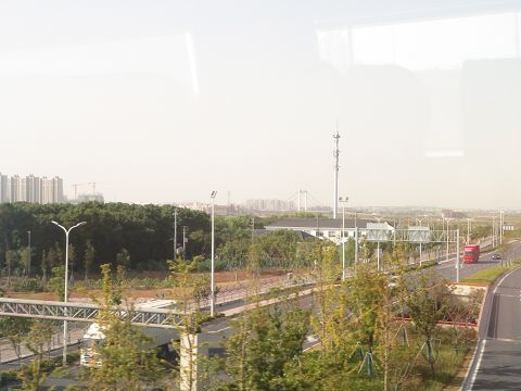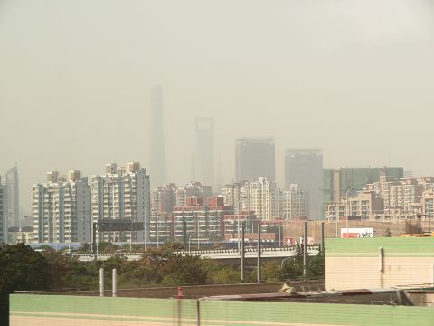 ↑ 上海タワーなど市内中心部の高層ビルが、うっすら見えてきた。
