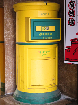 ↑ たまたま見つけた中国郵政の黄色いポスト。「取袋口」とあるので、特別なポストだと思う。