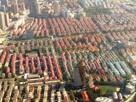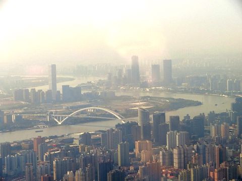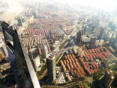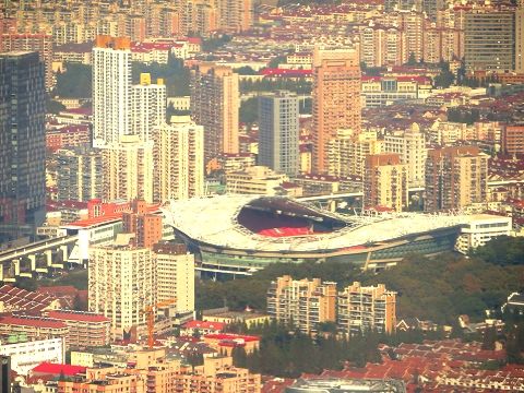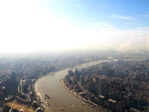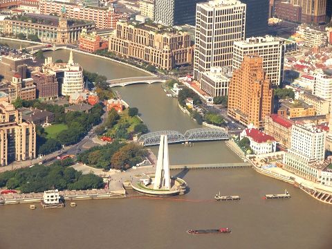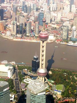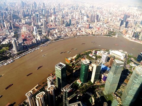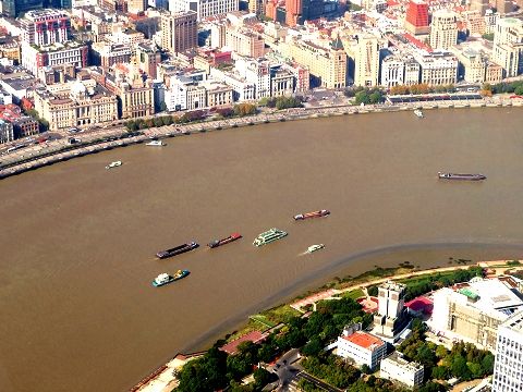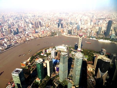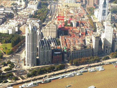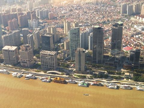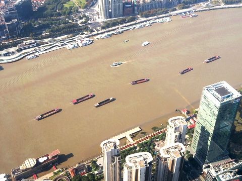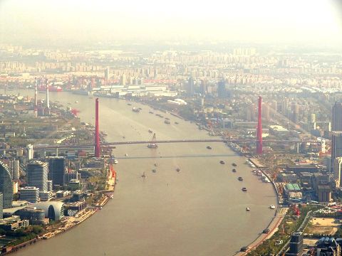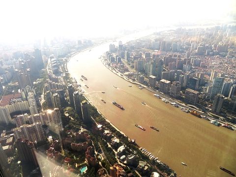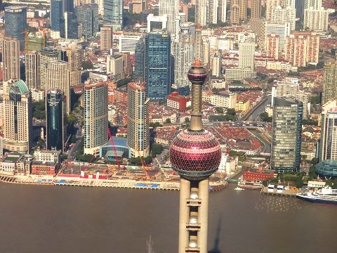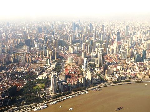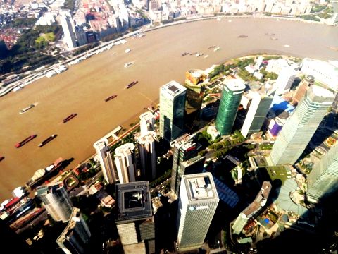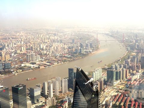 ↑ 上海タワーからの景色。手前は浦東(プードン)地区、黄浦江、対岸は外灘(ワイタン)地区。