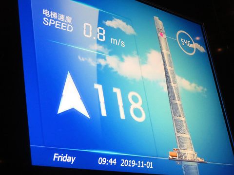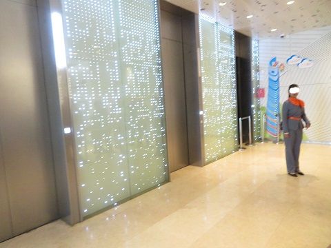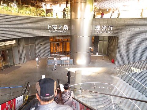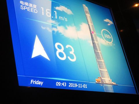 ↑ 上海タワーのエレベーター。 三菱エレベーターが設置されている。