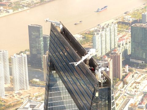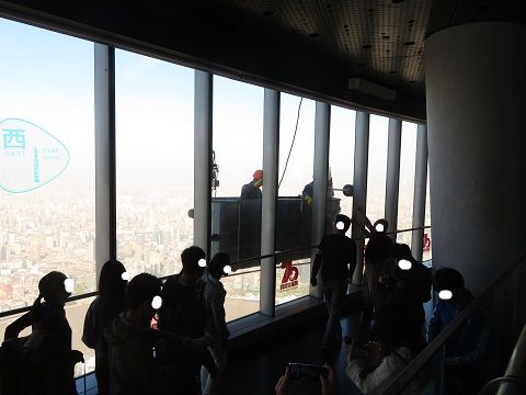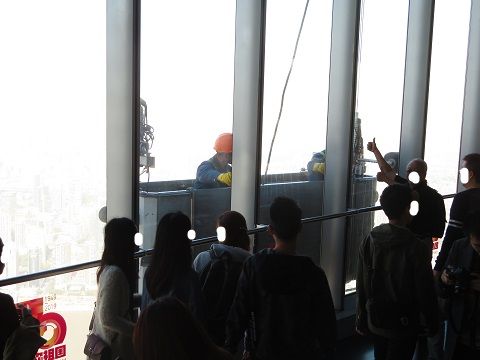 ↑ 展望台の様子。ビルの窓を清掃していた。