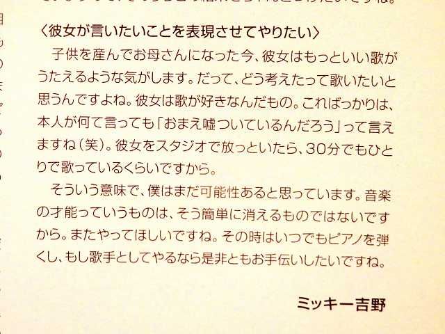 河合奈保子さんのCDボックス「JEWEL BOX 2」に冊子があり、ミッキー吉野さんが奈保子さんについてメッセージを書かれています。
