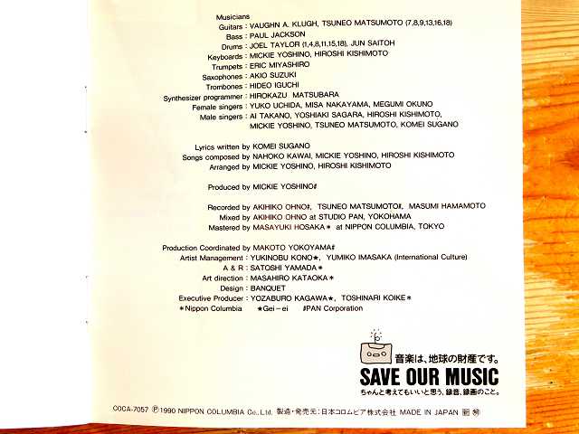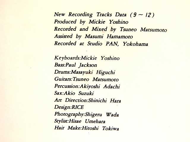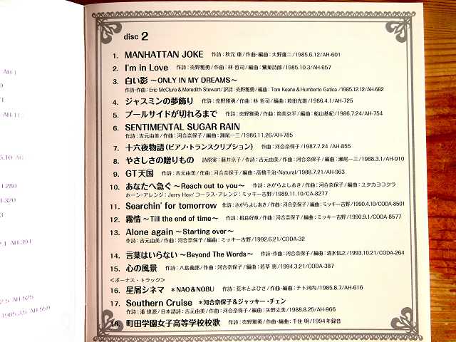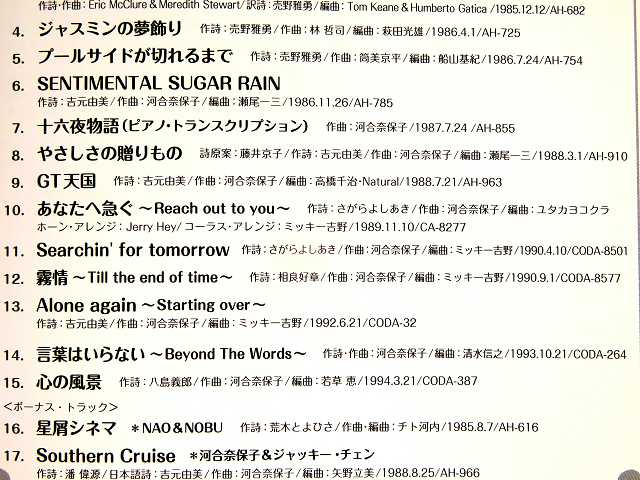 ↑ ミッキー吉野さんの編曲は、(10)あなたへ急ぐ、(11)Searchin' for tomorrow、(12)霧情、(13)Alone again。