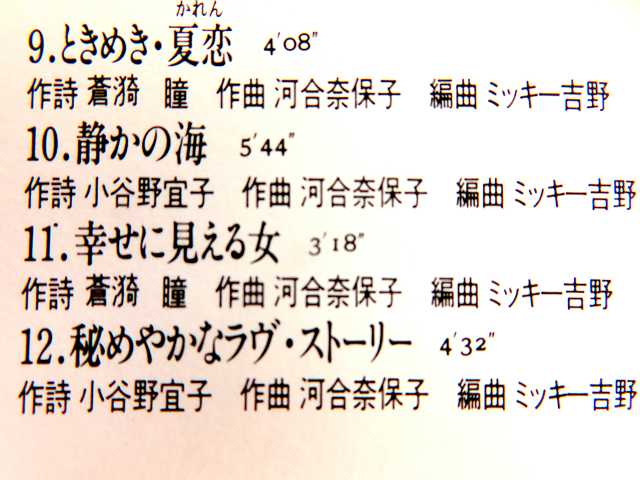 ↑ ミッキー吉野さんの編曲は(9)ときめき・夏恋(かれん)、(10)静かの海、(11)幸せに見える女、(12)秘めやかなラヴ。ストーリー。