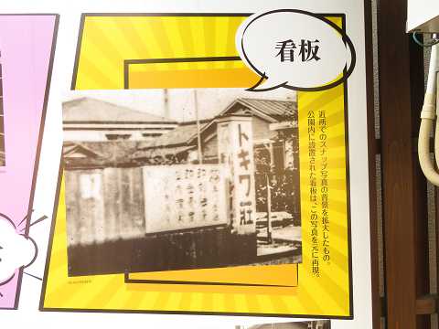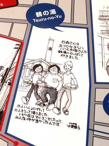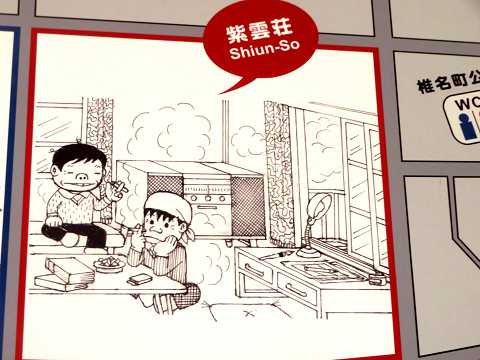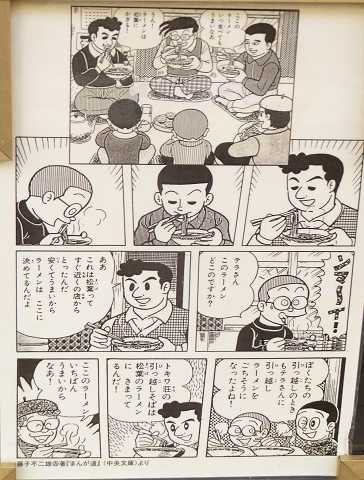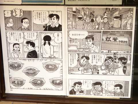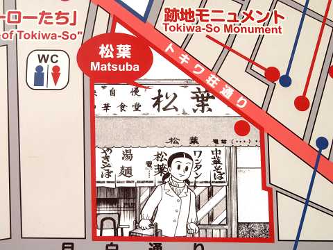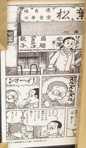 トキワ荘の漫画家がよくラーメンを食べた中華料理店「松葉」があります。漫画に描かれた「松葉」の部分が、入り口に紹介されています。