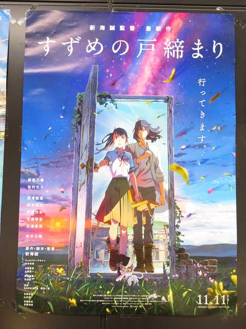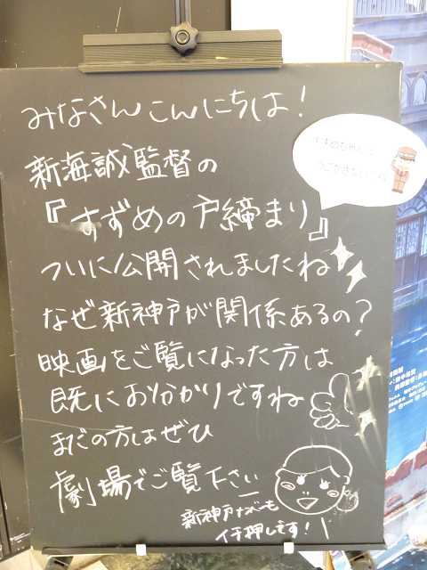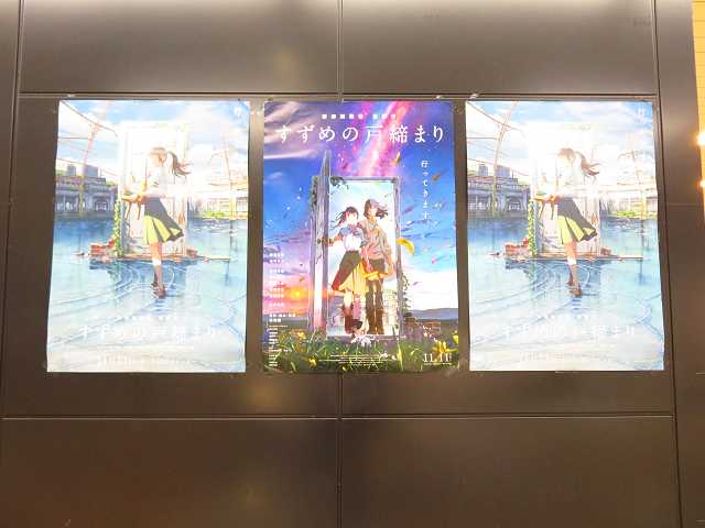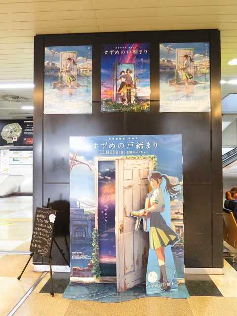 新神戸駅構内では、新海誠監督の新作映画「すずめの戸締まり」(2022年11月11日封切り)のパネルとポスター、案内板が掲示されていました。