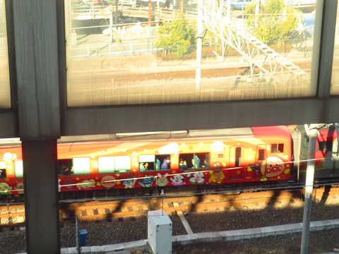 ↓ 岡山駅近くで、JR四国の「あかいアンパンマン列車」を見た。