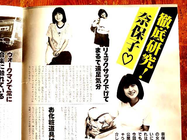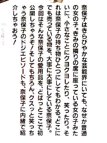 「ナオコはきらびやかな芸能界にいても、なぜか普通の女の子。きみの隣の席に座っている女の子みたいに、小さなことにクヨクヨしたり、笑ったり。それは奈保子の持ち物ひとつにしてもわかる。どこにでも売っている物を、大事に大事にしている奈保子。