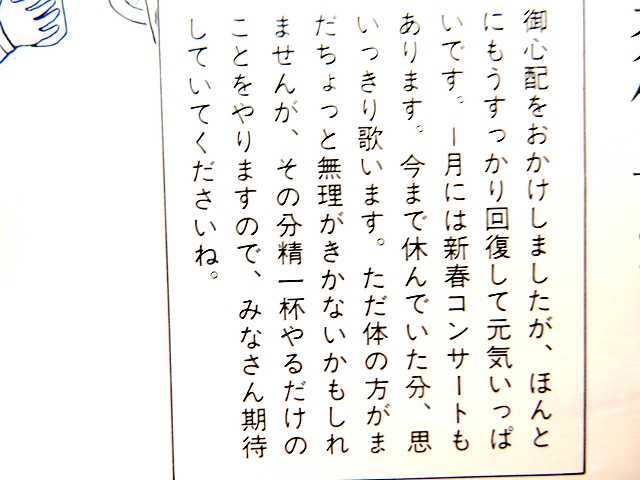 今まで休んでいた分、思いっきり歌います。ただ体の方がまだちょっと無理がきかないかもしれませんが、その分精一杯やるだけのことをやりますので、みなさん期待していてくださいね。