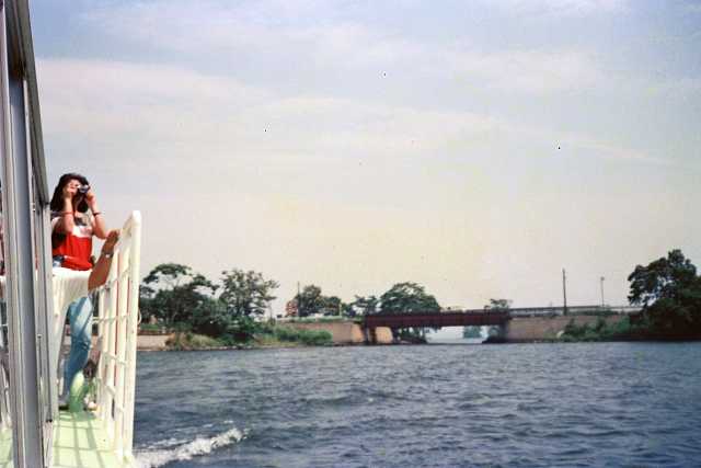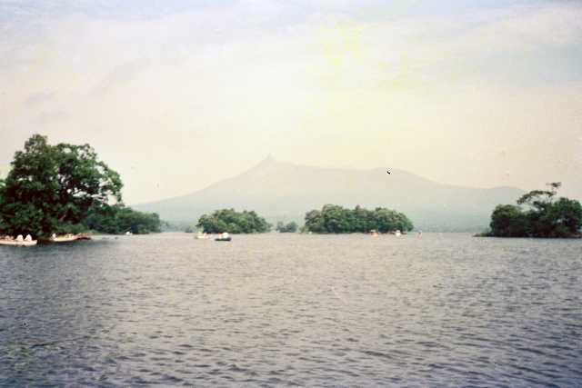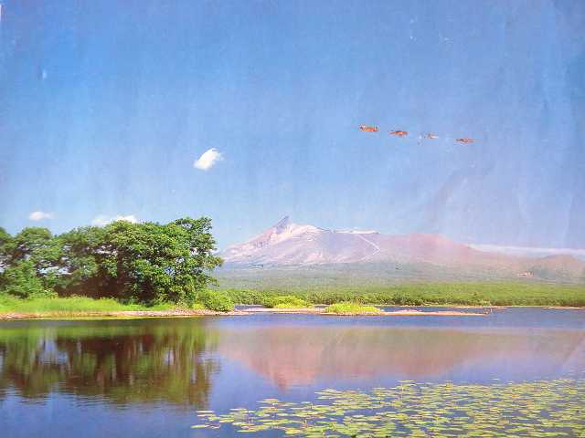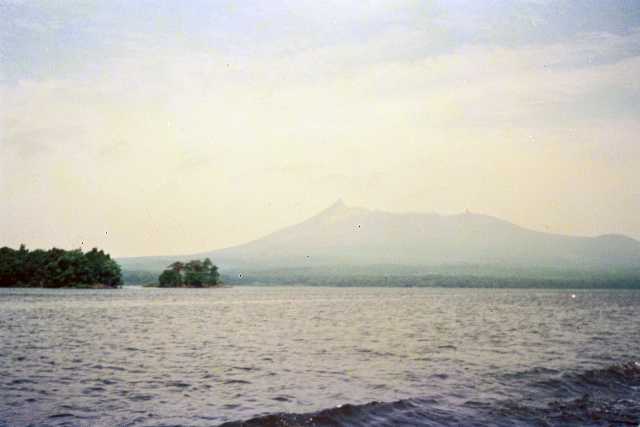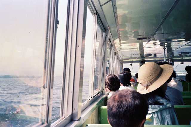 ・大沼では遊覧船に乗った。大沼の後方に、美しい駒ヶ岳(1,133m)が見えた。