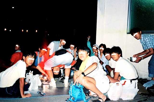 ・駅近くで、皆で寝袋を並べて野宿をした。