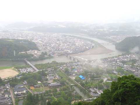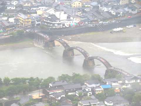 ↓ 岩国城天守閣から見た錦川と錦帯橋。