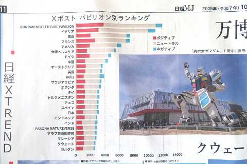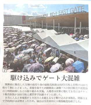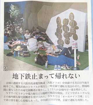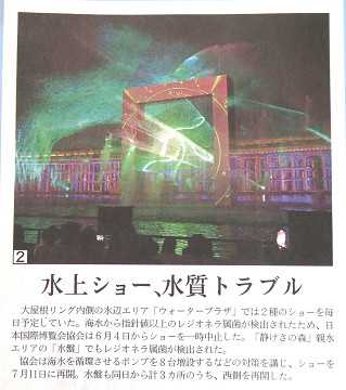 ② 水上ショ―、水質トラブル。 大屋根リング内側の水辺エリア「ウォータープラザ」では2種のショーを毎日予定していた。海水から指針値以上のレジオネラ属菌が検出されたため、日本国際博覧会協会は6月4日からショーを一時中止した。「静けさの森」親水エリアの「水盤」でもレジオネラ属菌が検出された。 協会は海水を循環させるポンプを8台増設するなどの対策を講じ、ショーを6月11日に再開。水盤も同日から計3カ所のうち、西側を再開した。