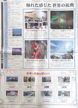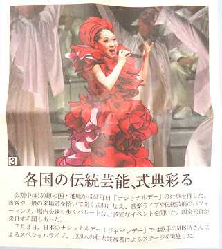 ③ 各国の伝統芸能、式典彩る 会期中は150超の国・地域がほぼ毎日「ナショナルデー」の行事を催した。 賓客や一般の来場者を招いて開く式典に加え、音楽ライブや伝統芸能のパフォーマンス、場内を練り歩くパレードなど多彩なイベントを開いた。国家元首が来日する国もあった。 7月3日、日本のナショナルデー「ジャパンデー」では歌手のMISHAさんによるスペシャルライブ、1000人の和太鼓奏者によるステージを実施した。
