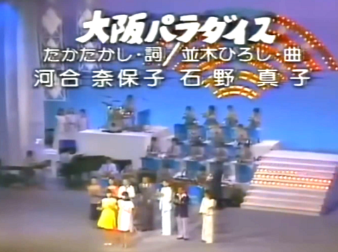 【2025年大坂・関西万博記念ということで】河合奈保子さんと石野真子さんが、海原さおり・しおりさんの「大阪パラダイス」を歌ったことがあります。「難波の街にネオンが灯りゃ若い心がまた出会うすてきだね すてきだわ天満橋から星を見て明日を占う大阪、大阪大阪パラダイス」ーーーーーーーーーーーーーーーーー↓ 大阪パラダイス河合奈保子さん、石野真子さん。↓ 河合奈保子さんと石野真子さん。↓ 石野真子さん。↓ 河合奈保子さんと石野真子さん。↓ 河合奈保子さん。