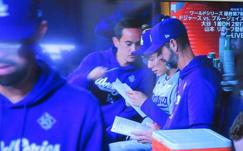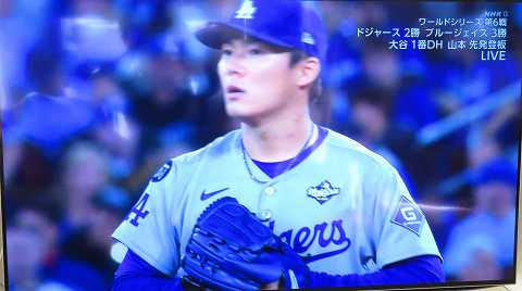 2025年10月26日(米国25日)、カナダ・トロントで行われた大リーグのワールドシリーズ(WS)第2戦・ドジャース対ブルージェイズの試合を、妻と一緒にテレビで見ました。ドジャーズは山本由伸投手が先発です。ピンチは落ちるカーブで切り抜け、4回以降は一人の走者も許さず、105球で完投勝ちをしました。素晴らしい投球でした。2025年11月27日付朝日新聞朝刊によると、WSで完投勝利が記録されるのは、2015年のクエト(ロイヤルズ)以来10年ぶりで、同一ポストシーズンでの2試合連続完投勝利となると、2001年のシリング(ダイヤモンドバックス)以来で、24年ぶりだそうです。ーーーーーーーーーーーーー↓ WS第2戦(ドジャーズ対ブルージェイズ)山本由伸投手先発。ーーーーーーーーーーーー↓ ドジャーズ5点でリードし、9回裏を迎えた。↓ 山本由伸投手。↓ ゲレーロ選手。↓ ゲレーロ選手を抑えた。↓ 9回2アウト バーショ選手。↓ スミス捕手。↓ 9回を無事に抑えて勝った山本投手。↓ 山本投手とスミス捕手。↓ 大谷選手。↓ 大谷選手と山本投手。5対1でドジャーズの勝ち。↓ 2025年10月27日付 朝日新聞朝刊。山本 球史に刻む連続完投。