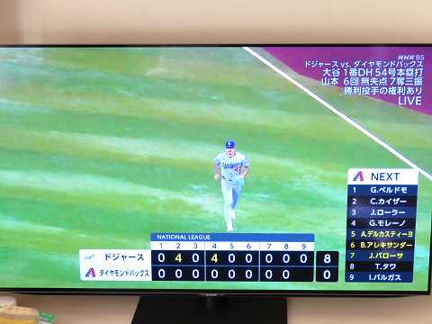 2025年9月26日朝(米国25日)、ドジャース対ダイヤモンドバックス戦の最後の部分をテレビで見ました。ドジャースが8対0で勝ち、ナショナルリーグ西地区で優勝しました。写真を少し撮った後、会社に行くため急いで家を出ました。2025年9月25日付朝日新聞朝刊に優勝に関する記事があるので、一部を紹介します。ドジャーズⅤ4 PS進出13年連続揺るがぬ山本 主役完遂開幕から先発の柱 12勝・200K大谷 祝砲54号大リーグは25日、各地であり、ドジャースが敵地でダイヤモンドバックスを8-0で破り、4年連続のナ・リーグ西地区優勝を決めた。ポストシーズン(PS)進出は13年連続。大谷は「1番・指名打者」で出場し、5打数1安打2打点。シーズン54号2点本塁打を放った。リーグ最多本塁打争いで首位のシュワバー(フィリーズ)に、残り3試合で2本差とした。先発の山本は6回無失点で12勝目。日本投手7人目のシーズン200奪三振を達成した。ーーーーーーーーーーーーー2025年9月25日(日本26日)ドジャース対ダイヤモンドバックス。↓ 朝日新聞朝刊2025年9月27日付