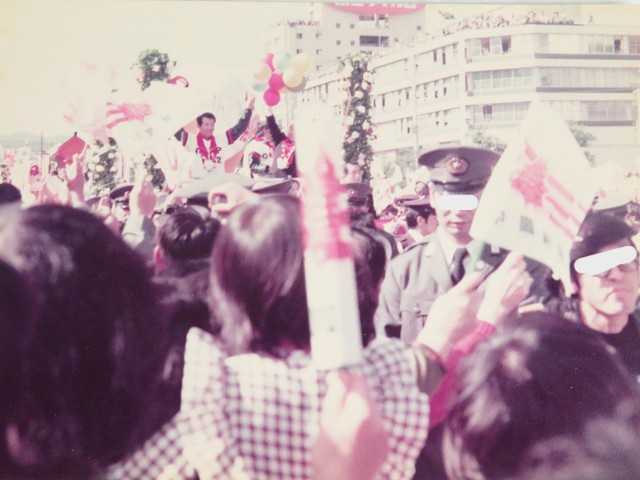 1975年10月20日(月)、広島平和大通りで広島東洋カープ初優勝パレードが行われました。1975年10月15日午後、後楽園球場で古葉竹識監督率いるカープが巨人に4-0で勝利し、球団創設26年目で初優勝しました。その5日後に行われた優勝パレードの写真です。私の父親からもらい、田舎に保管してあった写真を紹介します。また、写っている方については、私の小・中学校時代で学校が一緒だった仲の良い友人に確認してもらいました。この友人はカープファンで、子ども代表として古葉監督にインタビューをして記事になったことがあります。ーーーーーーーーーーー↓ 1975年10月20日 広島東洋カープ初優勝パレード。古葉竹識監督。↓ 古葉竹識監督と松田オーナー。↓ 古葉竹識監督と松田オーナー。↓ 渡辺弘基選手(左側)と、宮本幸信投手(右側)。↓ 衣笠祥雄選手(左側)と重松さん(右側)。↓ 衣笠祥雄選手。↓ 外木場義郎投手(前)、後ろの8番は山本浩二選手。↓ ホプキンス選手。↓ 金城基泰投手。↓ 木下剛史選手。