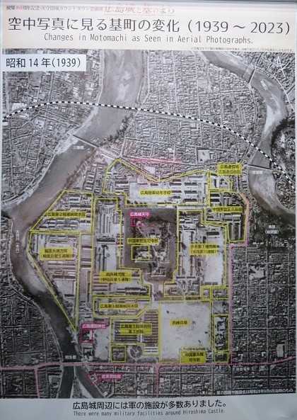 2025年10月13日、久しぶりに広島城を見学しました。城内では、「被爆80周年記念・天守閉城カウントダウン企画展・広島城と基町」の一環で、「空中写真に見る基町の変化(1939~2023)」というパネル掲示がありました。基町(もとまち)は、広島城そばの地名です。私はこのような写真を見るのが好きなので、一部を紹介します。ーーーーーーーーーーーーーーー「空中写真に見る基町の変化(1939~2023)」↓ 1939年(昭和14年)広島城周辺には軍の施設が多数ありました。↓ 1945年7月(昭和20年)原子爆弾投下直前の広島です。戦況悪化に伴い、西練兵場に耕作地ができています。↓ 1945年8月(昭和20年)原子爆弾投下により、街は壊滅しました。↓ 1947年(昭和22年)軍の施設はなくなり、広島城西側には多くの応急住宅が建設されました。↓ 1962年(昭和37年)広島城北側にあった、堀の埋め立て跡が区画整理などにより完全に消滅しました。南側には市民球場や官公庁が建ち並び、復興の様子が伺えます。↓ 1966年(昭和41年)弾薬庫の土塁がなくなりました。これにより、軍関連の施設はほぼなくなりました。↓ 1969年(昭和44年)三條橋北側の本川が埋め立てられています。↓ 1972年(昭和47年)埋め立てられた本川に長寿園アパートなど高層住宅が建ちました。また、市営基町高層アパートも建設されています。↓ 1975年(昭和50年)この年、山陽新幹線(岡山~博多間)が開業しました。