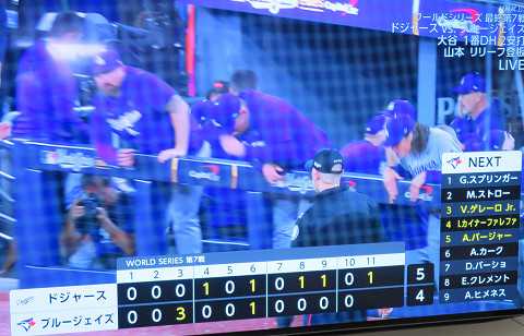 2025年11月1日(米国10月31日)、大リーグ・ワールドシリーズ第6戦をTV観戦しました。カナダのブルージェイズはすでに3勝で大手を掛けており、2勝のドジャースは絶対に勝つ必要がありました。ドジャースの先発は山本由伸投手で、6回まで好投しました。球数が多かったのでロブレスキー投手と交代しました。3回表・ドジャースの攻撃では、エドマン選手のヒット、大谷選手の敬遠、スミス選手のヒットで塁を埋めた後、ベッツ選手のヒットで3点、ブルージェイスはその裏にスプリンガー選手のヒットで1点を上げ、その後は無得点が続きます。佐々木朗希投手は8回からマウンドに上がりました。9回は先頭のカーク選手にデットボールを投げ、続くバージャー選手には左中間へ打たれてしまいます。ところがこの打球が外野フェンスと地面の間に挟まり、センターのディーン選手が挟まったボールを指さして、審判にエンタイトルツーベースを主張しました。ブルージェイズのカーク選手、バージャー選手はこの間にホームインしましたが、結局審判はエンタイトルツーベースを認め、2人の選手は2塁、3塁に戻ってからのスタートとなりました。ここで佐々木投手は降板し、第7戦先発予定だったグラスナウ投手が引き継ぎました。グラスナウ投手はクレメント選手を内野フライで打ち取り1アウトを取ります。次のヒメネス選手が打った浅い打球をレフトのキケ・ヘルナンデス選手が捕球し、すぐに2塁のロハス選手に投げました。2塁から飛び出していたバージャー選手が急いで戻りましたが、間一髪ロハス選手の捕球が早く、劇的なダブルプレーでドジャースが勝ちました。3勝3敗のタイとなり、試合は第7戦にもつれ込むことになりました。見てて本当に面白い試合でした。ーーーーーーーーーーーー2025年WS第6戦。山本由伸投手先発。ーーーーーーーーーーー↓ 3回 ドジャースの攻撃。↓ エドマン選手のヒット。↓ 大谷選手は敬遠。↓ スミス選手のヒットで満塁。↓ ベッツ選手。↓ ベッツ選手がヒット。↓ ドジャース2点追加で3点になった。ーーーーーーーーー↓ 8回を抑えた佐々木投手が9回もマウンドに上がった。↓ 佐々木朗希投手。↓ スネル投手と山本投手。↓ 大谷投手のボールがカーク選手に当たり、デッドボール。↓ バージャー選手。↓ グラスナウ投手がブルペンで投球練習をした。↓ 山本投手と大谷選手。↓ バージャー選手が打った。↓ エドマン選手と交代したディーン選手が、ボールを追う。↓ ボールがフェンスと地面の間に挟まっているのを見て、ディーン選手がエンタイトルツーベースをアピールした。↓ ディーン選手がアピールしている間に、ブルージェイズの2選手がホームへ走る。↓ 2人が生還。↓ 佐々木朗希投手。↓ 審判がエンタイトルツーベースを認めた。ブルージェイズの2選手は、2塁、3塁に戻った。↓ ここで、佐々木投手が降板し、グラスナウ投手に交代した。↓ グラスナウ投手。↓ 佐々木投手。↓ 山本投手。↓ クレメント選手。↓ クレメント選手は内野フライ。↓ これで1アウト。↓ ヒメネス選手。↓ ヒメネス選手が打った。↓ 浅く守っていたレフトのキケ・ヘルナンデス選手がキャッチして2アウト。そのままセカンドのロハス選手にボールを投げた。↓ 2塁を飛び出していたバージャー選手が急いで2塁に戻るも、ロハス選手の捕球が間一髪早く、これで3アウト、ゲームセット。↓ 喜びに叫ぶロハス選手。↓ 喜ぶ山本投手、佐々木投手。↓ 第6戦は3対1でドジャースが勝った。ーーーーーーーーーーーー↓ リプレイ。ヒメネス選手が打った。↓ レフトのキケ・ヘルナンデス選手がキャッチし、セカンドのロハス選手に投げた。↓ 飛び出したバージャー選手が急いで2塁に戻ろうとした。↓ バージャー選手が2塁に戻る直前、ロハス選手がボールをキャッチした。↓ 判定はアウト!↓ 別角度から。↓ バージャー選手が2塁に戻る前に、ロハス選手がボールをキャッチした。
