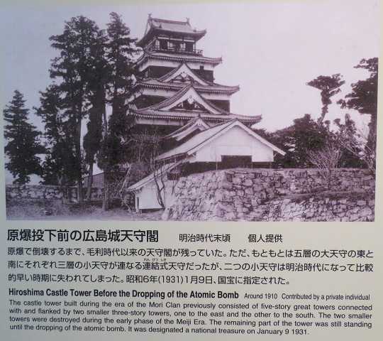 2025年10月13日、広島城天守閣の中を見学しました。原爆投下前から後の広島城の変遷がパネルで掲示されていたので、紹介します。ーーーーーーーーーーー【原子爆弾が投下される以前の広島城】明治維新後、旧広島城内一帯は軍の管轄下におかれ、軍事施設が次々につくられていった。その一方で、旧城内にあった建物や、周囲を取り囲んでいた櫓などの城郭建築のほとんどは取り壊されたり火災で焼失して失われてしまった。その結果、原爆投下時には、本丸の天守閣と中御門(なかごもん)、二の丸の表御門(おもてごもん)、太鼓櫓(たいこやぐら)、多聞櫓(たもんやぐら)の一部などが残るだけとなっていた。↓ 原爆投下前の広島城天守閣(明治時代末頃 個人提供)原爆で倒壊するまで、毛利時代以来の天守閣が残っていた。ただ、もともとは五層の大天守の東と南にそれぞれ三層の小天守が連なる連結式天守だったが、二つの小天守は明治時代になって比較的早い時期に失われてしまった。昭和6年(1931)1月9日、国宝に指定された。↓ 広島鎮台(ちんだい)司令部本館 明治10年代(1874~86)頃 広島城蔵明治7年(1874)に広島鎮台司令部が置かれていた旧本丸御殿が火事で焼失したため、新たに建てられたのがこの建物である。明治21年、広島鎮台が第5師団と改称され、第5師団司令部となる。日清戦争時代(1894-95)には大本営として使われた。その後は大本営跡として保存され、多くの見学者が訪れた。↓ 西練兵場 明治時代後期 柴彰彦氏蔵/広島市公文書館提供旧広島城の大手廓(おおてくるわ)にあった武家屋敷は取り払われ、明治8年6月、広大な練兵場となった。明治23年(1890)に二葉の里(ふたばのさと)に新しい練兵場(東練兵場)ができた後は「西練兵場」と呼ばれた。普段は軍隊の訓練に使われたが、しばしば博覧会や運動競技会など、さまざまなイベントの会場ともなった。↓ 日清戦争時の表御門(おもてごもん) 明治27ー28年(1894ー95)広島城蔵菊の御紋入りの幕が張られ、「大本営」の門標が掲げられている。日清戦争中の明治27年9月15日から翌28年4月27日まで明治天皇は広島に滞在され、その間、広島城本丸の第5師団司令部庁舎(旧広島鎮台司令部本館)が大本営となった。↓ 帝国議会仮議事堂 明治27年(1894)10月 広島市公文書館提供日清戦争中、大本営が置かれた広島は臨時の首都の役割を果たした。明治27年10月15日、臨時帝国議会が西練兵場内に建設された仮議事堂に召集されている。帝国議会(戦後は国会)が首都東京以外で開催されたのは、戦前戦後を通じてこのときだけである。↓ 第五師団司令部一号庁舎 大正15年(1926)頃 広島市郷土資料館提供旧第五師団司令部庁舎が日清戦争時に大本営として使われ、戦争終結後も大本営跡として保存されることとなったため、明治29年(1896)に新しい司令部庁舎が広島城本丸下段(現在の広島護国神社付近)に建てられた。↓ 軍事施設が建ち並ぶ広島城周辺 昭和2年(1927)広島城蔵広島城周辺を北西上空から撮影した写真。大五師団司令部がある本丸を中心に、東に歩兵第十一連隊、南に西練兵場、西に野砲兵第五連隊と広島衛戍(えいじゅ)病院、北に大正14年(1925)に廃止された歩兵第七十一連隊跡(のち広島陸軍幼年学校となる)が見える。↓ 歩兵第十一連隊 1920年代頃 広島市郷土資料館提供歩兵第十一連隊は明治8年(1875)の誕生以来、広島鎮台(のち第五師団)の期間となった部隊。兵営は広島城の内堀の東側(現在の中区上八丁堀付近)一帯を占めた。↓ 野砲兵第五連隊 明治時代末頃 個人提供明治11年(1878)、山砲兵大中隊として設置された砲兵の部隊。その後たびたび編成替えされ、明治40年(1907)、野砲兵第五連隊となった。衛兵は広島城の内堀の西側から南西側(現在の市営基町高層アパート・中央公園の東側付近)一帯を占めた。↓ 見学者で賑わう天守閣 昭和時代初期 個人提供昭和3年(1928)1月、広島城の天守閣は大本営跡とともに第五師団から広島県に移管され、その年の10月から一般公開された。昭和9年には明治天皇の来広40周年を記念した展覧会が大本営跡と天守閣を会場として開催され、15日間に23万人余りが訪れた。↓ 広島県物産共進会 大正4年(1915年) 広島市公文書館提供広島県物産共進会は大正4年4月5日から5月14日まで、広島県物産陳列館(現在の原爆ドーム)を第1会場、西練兵場を第2会場として開催された博覧会的な催し。西練兵場では、こうした博覧会や運動競技会などの大きな催しがしばしは開催された。↓ 招魂祭(しょうこんさい) 上西薫氏筆/広島平和記念資料館提供昭和9年(1934)秋の招魂祭のようすを描いた絵。招魂祭は毎年春か秋に西練兵場で行われた官祭広島招魂社(昭和14年、広島護国神社と改称)の祭礼。競馬や自転車競走、オートレースなどが開催されたほか、屋台や見世物小屋がずらりと並び、戦前の広島市民がもっとも楽しみにしていた祭のひとつだった。ーーーーーーーーーーー*1945年8月6日 8時15分 広島市に原爆が投下された【原爆の被害】旧広島城内は爆心地からほぼ1.5Km圏内にあったた