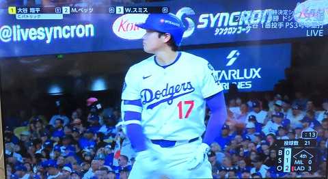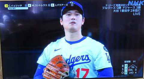 2025年10月18日(米国時間17日)、ロサンゼルスでポストシーズン(PS)のナ・リーグ優勝決定シリーズ(NLCS)で、ドジャース対ブルワーズ第4戦が行われました。大谷選手は「1番・投手兼指名打者」で出場し、投手としては6回3分の0を2安打無失点、打者としては3打数で三本塁打という素晴らしい成績を上げました。試合は5対1でドジャーズが勝利し、大谷選手は同シリーズの最優秀選手(MVP)に選ばれました。TV中継を見ていましたが、大谷選手の活躍に夢中になり、妻と大騒ぎでした。人生の中でも、本当にワクワクさせられた試合でした。まずは、大谷選手が1回表、四球を出した後に3者連続三振を取り、その裏は先頭バッターとして打席に立ち、いきなりライトにホームランをたたき込む辺りを紹介します。ーーーーーーーーーーーーーーー2025年10月18日(米国時間17日)、ロサンゼルスでポストシーズン(PS)のナ・リーグ優勝決定シリーズ(NLCS)で、ドジャース対ブルワーズ第4戦が行われた。↓ ミルウォーキーブルワーズ対ロサンゼルスドジャース。↓ 大谷選手。↓ 大谷投手。↓ 1回表、1番デュラング選手。↓ 四球となった。↓ 2番チョリオ選手。↓ チョリオ選手は三振。↓ 3番イェリッチ選手。↓ イェリッチ選手は三振↓ 4番コントレラス選手も三振。(三者連続三振に打ち取った大谷投手)↓ 1回裏、先頭打者の大谷選手。↓ キンタナ投手と大谷選手。↓ キンタナ投手。↓ 大谷選手が振り抜いた。↓ ライトへホームラン。↓ 大谷選手のホームランでドジャーズ1点先制。ーーーーーーーーーーーリプレー映像。
